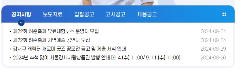 9. 공지사항에서는 제22회 허준 축제 운영자 모집 공고 등 강서구에서 진행하는 주요 행사와 관련된 정보를 확인할 수 있었습니다. 주민들에게 참여할 수 있는 기회를 제공하는 행사들이 많아서 지역사회의 활력을 느낄 수 있었네요.
