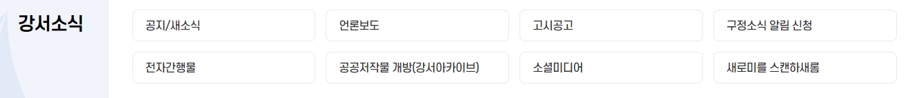 6. 강서 소식 메뉴에서는 구정 관련 다양한 소식을 확인할 수 있습니다. 공지 사항, 언론 보도, 고시 공고 등 중요한 정보들을 놓치지 않고 확인할 수 있도록 구성이 잘 되어 있었습니다. 특히, 주민들에게 필요한 정보들이 실시간으로 업데이트되고 있어 신뢰감이 가네요.