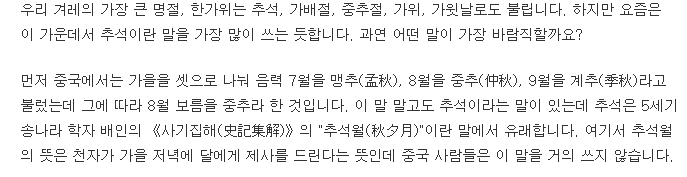 3. 중국에서는 가을을 셋으로 나누어 음력 7월을 맹추(孟秋), 8월을 중추(仲秋), 9월을 계추(季秋)라고 불렀는데, 그에 따라 8월 보름을 중추라 한 것이죠. 이 말 말고도 추석이라는 말이 있는데, 추석은 5세기 송나라 학자 배인일의 《사기집해(史記集解)》의 ‘추석월(秋夕月)’이란 말에서 유래한 것입니다. 여기서 추석월의 뜻은 가을 저녁에 달에게 제사를 드린다는 뜻인데, 중국 사람들은 이 말을 거의 쓰지 않는다고 해요.