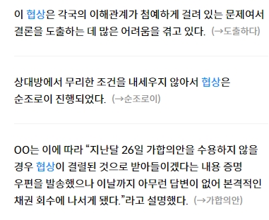5. 협상되다의 뜻은 ‘두 이상 사람들 사이에서 타결하기 위해 협의되다’예요. 이 표현은 두 나라나 여러 사람이 참여하는 협의가 진행되거나 성공적으로 타결되었을 때 사용되죠. 협상 과정에서는 서로 간의 입장 차이를 좁히는 것이 중요해요.
