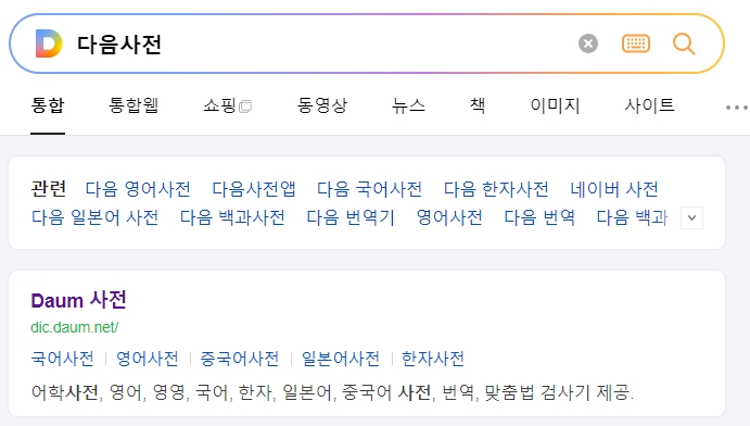 1. 다음사전으로 들어가면, 다양한 어학사전과 번역 기능을 제공해요. 국어, 영어, 영영, 한자, 일본어, 중국어 사전뿐만 아니라 맞춤법 검사기와 번역 기능도 있어서, 여러 언어의 뜻을 쉽게 찾아볼 수 있어요.