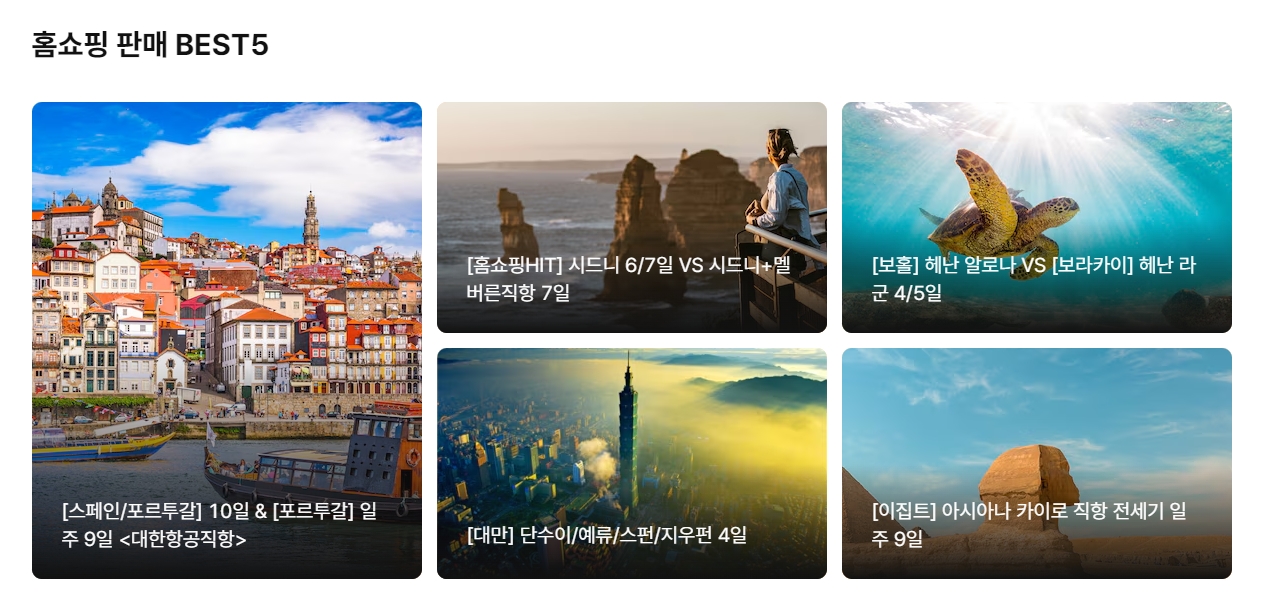 6. 마지막으로, 홈쇼핑 판매 상품도 소개되어 있었는데요, BEST5 상품으로 스페인과 포르투갈 여행, 대만 단수이 여행, 이집트 카이로 여행 등 다양한 지역을 커버하고 있더라구요. 이런 홈쇼핑 상품은 바로바로 구매할 수 있어서 편리하고, 고객들의 반응이 좋은 것들이라 신뢰가 가는 점이 장점이에요. 여행지를 고민하고 있다면 이런 추천 상품들도 한 번쯤 고려해보시면 좋을 것 같아요.