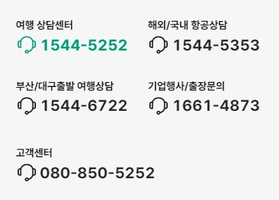 2. 홈페이지에서 가장 먼저 눈에 띈 건 여러 상담센터 연락처였어요. 여행 상담부터 항공, 기업 행사 문의까지 필요한 서비스에 맞게 전화로 쉽게 문의할 수 있도록 정리되어 있었어요. 부산이나 대구에서 출발하는 여행에 대한 상담 번호도 따로 있어서 지역에 맞춘 서비스가 있다는 점도 인상적이었어요.