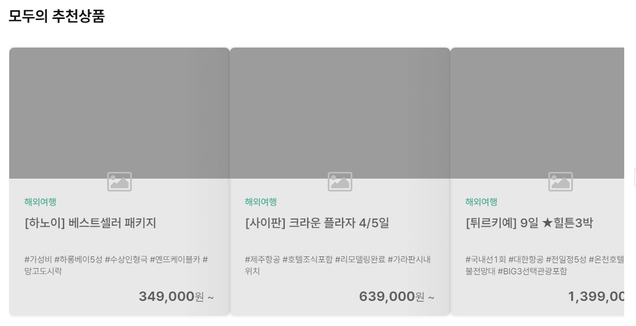 4. 다양한 추천 상품도 있었어요. 하노이, 사이판, 튀르키예 등 인기 있는 해외여행지의 패키지가 저렴한 가격으로 제공되고 있었는데요. 가격대가 비교적 합리적이고 일정도 다양해서, 여행 목적과 예산에 맞게 고를 수 있는 선택지가 많았어요. 특히나 패키지에 포함된 혜택들이 눈에 띄었는데, 숙박이나 관광지 입장료까지 모두 포함된 점이 매우 매력적이었어요.
