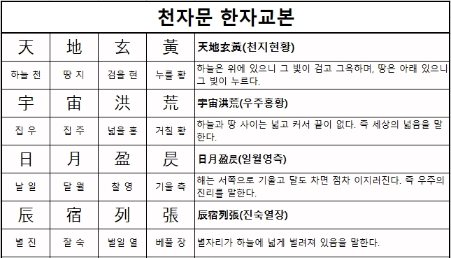 2. 천자문은 한자 학습을 위한 기본적인 교재로 사용되며, 각 글자마다 고유의 뜻을 담고 있습니다. 하늘 천, 땅 지, 검을 현, 누를 황 등 많은 분들이 익숙한 글자들도 있지만, 의외로 모르는 글자들도 많이 등장합니다. 그러므로 천자문을 학습하면서 자연스럽게 한자의 뜻과 음을 익힐 수 있습니다.