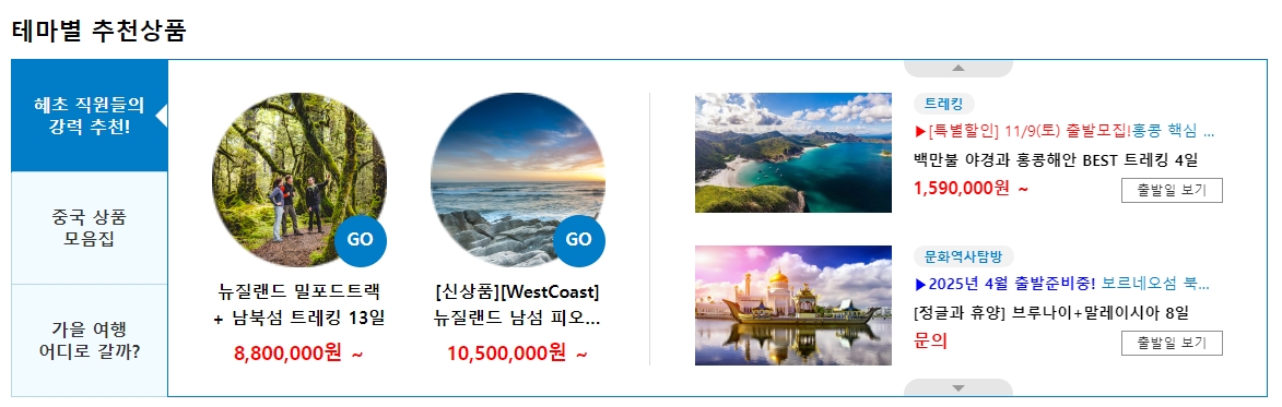 7. 테마별 추천 상품도 홈페이지에서 볼 수 있어요. 예를 들면 뉴질랜드의 밀포드트랙과 남섬 트레킹 같은 장거리 트레킹 상품부터 시작해서, 홍콩 해안 트레킹 같은 짧고 간편한 상품까지 다양한 선택지가 있죠. 각 상품마다 특색이 있어서 자신의 여행 스타일에 맞는 상품을 쉽게 고를 수 있어요.