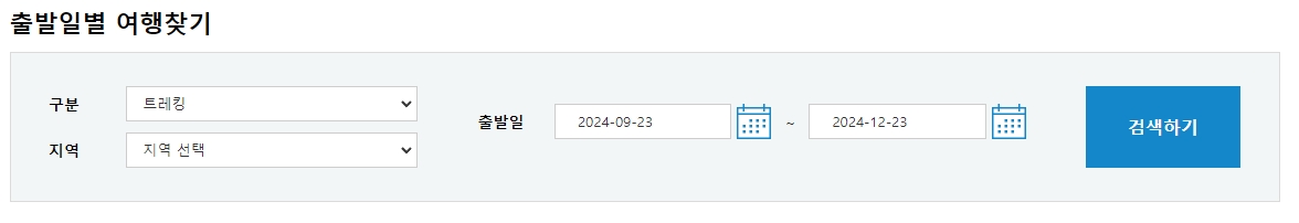 4. 트레킹 여행을 계획하는 사람들을 위해 출발일별로 여행을 찾을 수 있는 기능도 있어요. 원하는 날짜와 지역을 선택하면 그에 맞는 여행 상품을 바로 검색할 수 있어서 편리하죠. 여행을 준비할 때 출발 일정을 잘 맞춰야 하니까, 이렇게 날짜별로 검색할 수 있는 기능은 매우 유용합니다. 특히 바쁜 일정을 소화해야 하는 사람들이나 특정 시기에 맞춰 여행을 떠나고 싶은 분들에게 딱 맞는 서비스에요.