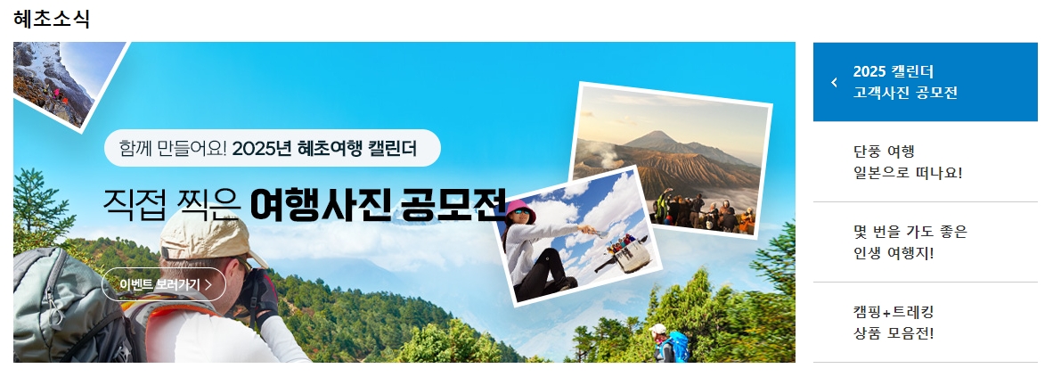 6. 혜초 여행사에서는 여행 사진 공모전 같은 고객 참여 이벤트도 진행하고 있어요. 이 공모전은 여행자들이 직접 찍은 멋진 여행 사진들을 제출해 다음 해의 여행 캘린더를 함께 만드는 방식이에요. 사진을 찍는 걸 좋아하는 여행자라면 이런 이벤트에 참여해 보는 것도 여행의 또 다른 재미가 될 수 있겠죠. 공모전 외에도 다양한 이벤트들이 있으니 홈페이지에서 확인해 보는 것도 좋습니다.