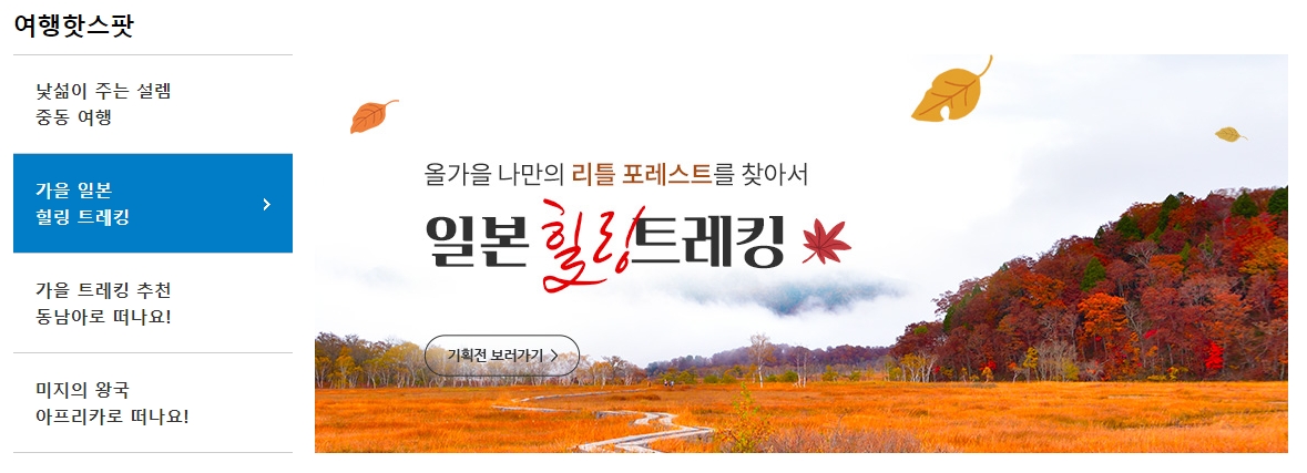 5. 일본 힐링 트레킹 같은 테마 여행도 소개하고 있는데요, 올가을에는 일본의 아름다운 산을 배경으로 한 힐링 트레킹 상품이 인기를 끌고 있어요. 이 프로그램은 일본의 자연 속에서 몸과 마음을 힐링할 수 있는 기회를 제공해줍니다. 일본의 가을 풍경을 만끽하며 힐링할 수 있는 특별한 경험을 원한다면 이 상품이 딱일 거예요.