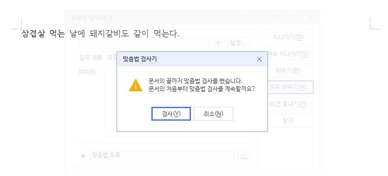 7. 모두 바꾸기를 선택하면 문서 끝까지 검사가 완료되었다는 메시지가 나오며, 계속 검사를 진행할지 그만둘지 선택할 수 있습니다.