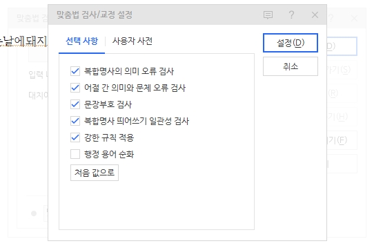 4. 설정 화면에서는 복합명사, 어절 간 의미, 문장부호, 강한 규칙 적용, 행정 용어 순화 등을 선택할 수 있습니다. 이러한 옵션을 통해 검사기의 정확도를 높일 수 있습니다.