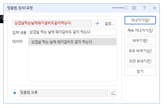 6. 설정을 마친 후 시작 버튼을 누르면, 문서 내의 틀린 부분이 표시됩니다. 제가 입력한 문장의 띄어쓰기가 제대로 수정되었는지 확인할 수 있습니다.