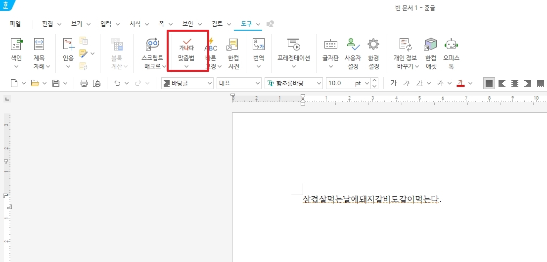 1. 임의의 문장을 일부러 띄어쓰기가 틀리게 작성한 후, 상단의 도구 탭을 클릭합니다.