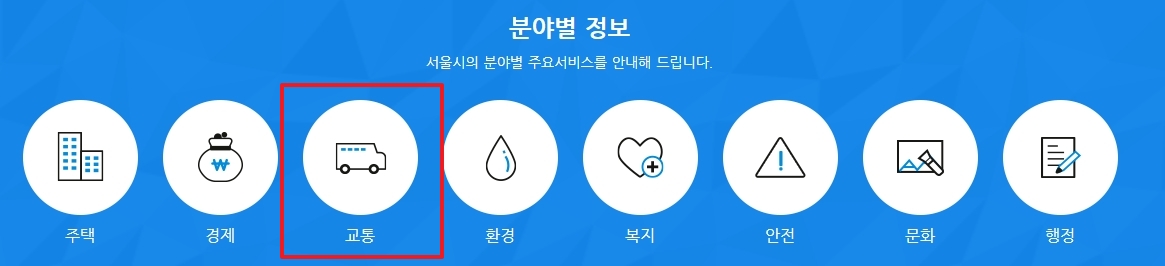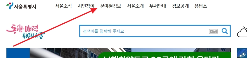 2. 상단 메뉴에서 분야별 정보를 클릭했습니다. 분야별 정보는 서울시청 홈페이지에서 시민들이 교통, 환경, 복지 등 다양한 분야의 정보를 손쉽게 찾을 수 있도록 구성되어 있습니다. 교통 정보도 이 메뉴에서 확인할 수 있습니다.