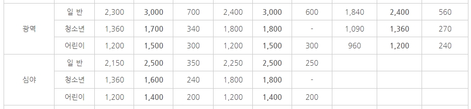 심야버스의 일반 요금은 교통카드 기준 2,150원에서 2,500원으로 350원이 인상되었으며, 현금 기준은 2,250원에서 2,500원으로 250원이 상승하였습니다. 청소년 요금은 교통카드로 1,360원에서 1,600원으로 240원이 올랐고, 어린이는 1,200원에서 1,400원으로 200원이 인상되었습니다.