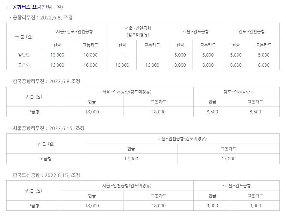 8. 공항버스 요금도 안내되었습니다. 서울에서 인천공항이나 김포공항을 오가는 공항버스의 요금도 교통카드와 현금 사용 시 차이가 있습니다. 일반 승객은 교통카드로 공항버스를 이용할 경우 10,000원의 요금을 내며, 고급형은 16,000원이 부과됩니다.