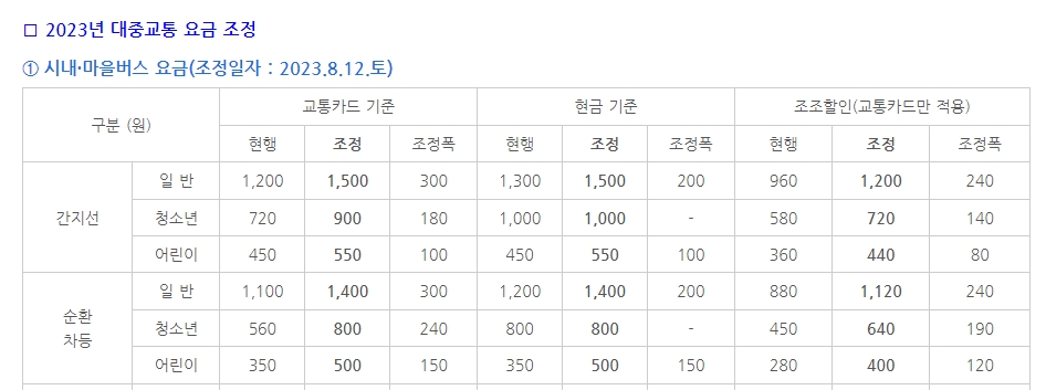 4. 마을버스와 시내버스 요금이 2023년 8월 12일에 조정되었습니다. 일반 승객의 경우 교통카드로 마을버스를 이용할 때 1,200원으로 책정되었고, 청소년은 600원, 어린이는 400원의 요금을 지불하게 됩니다. 현금 사용 시 요금은 조금 더 높아지며, 일반 승객은 1,300원, 청소년은 650원, 어린이는 450원을 내야 합니다.