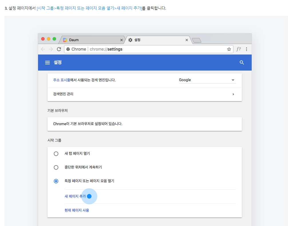 시작그룹룹 메뉴를 클릭하면 특정 페이지 또는 페이지 모음 열기라는 옵션을 볼 수 있습니다. 이 옵션을 선택하면 새 페이지 추가 버튼이 나타납니다. 이 버튼을 클릭하고, 원하는 웹사이트 주소를 입력하면 됩니다. 예를 들어, www.daum.net 주소를 입력하면, 크롬을 열 때마다 자동으로 다음 홈페이지가 열리게 됩니다.
