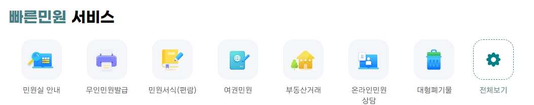 10. 주민들이 자주 사용하는 민원 서비스는 빠르고 쉽게 접근할 수 있도록 별도로 구성되어 있어요. 예를 들어, 무인 민원 발급기나 대형 폐기물 신청 서비스 등 일상에서 자주 이용하는 민원 서비스를 손쉽게 사용할 수 있죠. 덕분에 복잡한 절차 없이 간편하게 필요한 민원을 해결할 수 있어요.