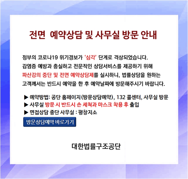 대한법률구조공단 홈페이지를 통해 무료 법률 상담을 받을 수 있습니다. 긴급하게 법률 문제의 해결 방안을 찾고자 할 때에는 132 법률상담 콜센터를 이용해 주시기 바랍니다.