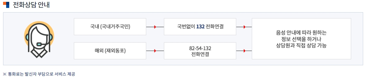 콜센터를 이용하실 때에는 국번 없이 132번을 누르시면 됩니다. 해외에서 이용하실 경우에는 82-54-132로 연락 주시기 바랍니다. 통화료는 발신자 부담으로 서비스를 제공하고 있어요.
