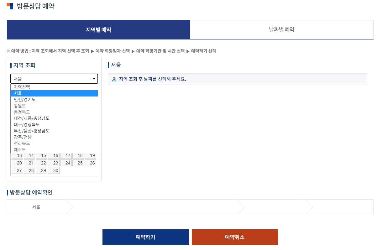 예약 시에는 지역과 지부를 선택한 후, 가능한 날짜와 시간을 선택하시면 됩니다. 현재 많은 분들이 방문 상담을 신청하고 있어 예약이 다소 지연될 수 있습니다. 최소 2주 이상의 대기 시간이 필요할 수 있으므로, 여유를 가지고 예약하시는 것이 좋습니다.