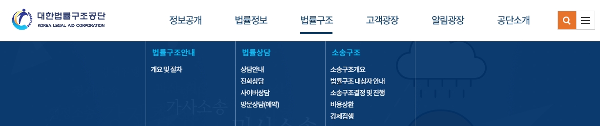 3. 상단 메뉴에서 법률구조를 클릭한 후, 법률상담 섹션을 선택하여 단계별로 안내받으실 수 있습니다. 각 단계별로 필요한 정보를 쉽게 확인하실 수 있습니다.
