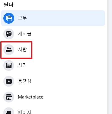 3. 친구의 이름을 검색한 뒤에 필터를 클릭하여 설정을 합니다. 저는 사람으로 한정하여 검색을 진행했습니다.