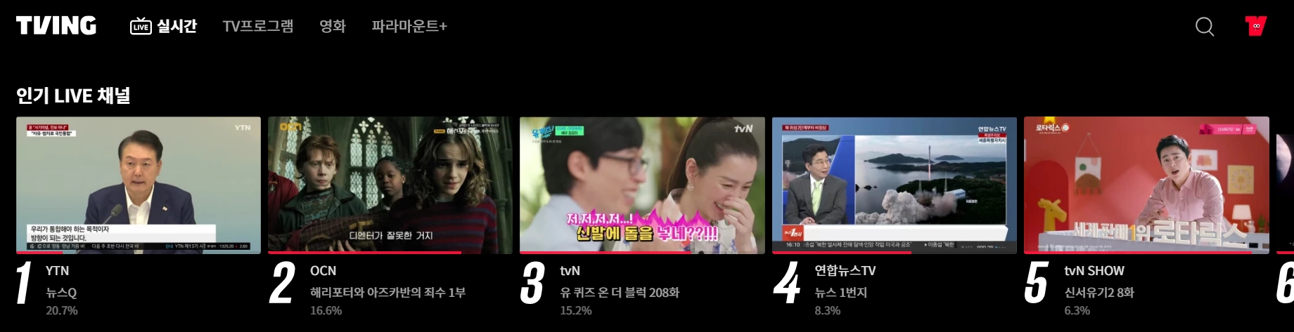 7. 클릭해보면 선택한 프로그램이 실시간 온에어로 재생되지만, 저는 주로 티빙의 다시보기 기능을 더 많이 사용하는 것 같아요. 실시간 시청보다는 편리하게 다시보기가 가능한 기능이 더 유용하더라고요.