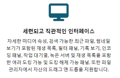 또한 세련되고 직관적인 인터페이스를 자랑합니다. 미디어 속성을 자세히 볼 수 있고, 검색 가능한 최근 파일, 썸네일이 포함된 재생 목록 등 다양한 기능을 갖추고 있어 편리합니다. 파일 관리자에서 자산을 드래그 앤 드롭하는 것도 지원합니다.