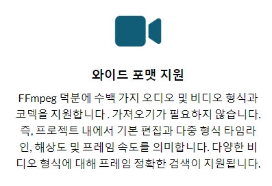 샷컷은 FFmpeg를 통해 수백 가지의 오디오 및 비디오 형식과 코덱을 지원합니다. 이는 프로젝트 내에서의 기본 편집, 다중 형식 타임라인, 다양한 해상도 및 프레임 속도에 대한 지원을 의미하며, 다양한 비디오 형식에 대해 프레임별로 정확한 검색이 가능합니다.