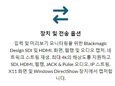 이 프로그램은 다양한 장치 및 전송 옵션을 지원합니다. 입력과 미리보기 모니터링을 위한 Blackmagic Design SDI 및 HDMI, 화면 및 웹캠 오디오 캡처, 네트워크 스트림 재생 등이 가능하며, 최대 4K 해상도까지 지원하며 다양한 소스로부터 캡처할 수 있습니다.
