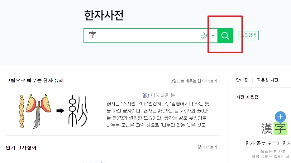 2. 한자 필기 인식 기능을 사용하려면, 검색창 우측에 있는 연필 모양의 아이콘을 클릭하세요. 이 기능을 통해 화면에 한자를 직접 그리면, 비슷한 한자들이 자동으로 추천됩니다.
