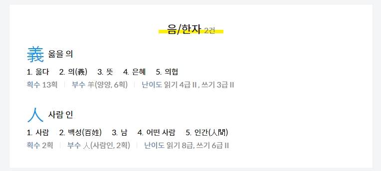 義人이라는 한자를 검색했을 때, 의는 옳을의 의미와 인은 사람을 의미하는 한자로 분해되어 각각의 음과 뜻이 따로 표시되고, 이를 통합하여 의인이라는 단어의 전체적인 의미를 이해할 수 있습니다. 이런 과정은 한자를 구성하는 개별적인 요소와 그 의미를 분명히 파악하는 데에 큰 도움이 됩니다.