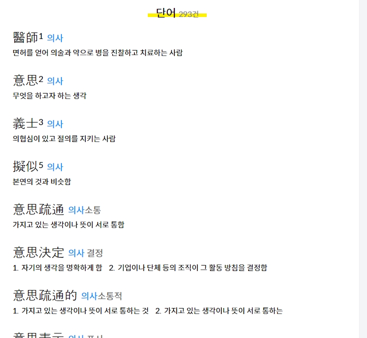 의사라는 단어를 검색하면, 다양한 의미의 한자어가 결과로 나오는데요. 예를 들면, 병을 진단하고 치료하는 의술인을 의미하는 의사, 의지나 결심을 나타내는 의사, 의로움과 절의를 중요시하는 의사 등 다양한 뜻이 나타납니다. 이처럼 한 단어에 여러 한자어의 의미를 제공함으로써 단어에 대한 깊이 있는 이해를 가능하게 합니다.