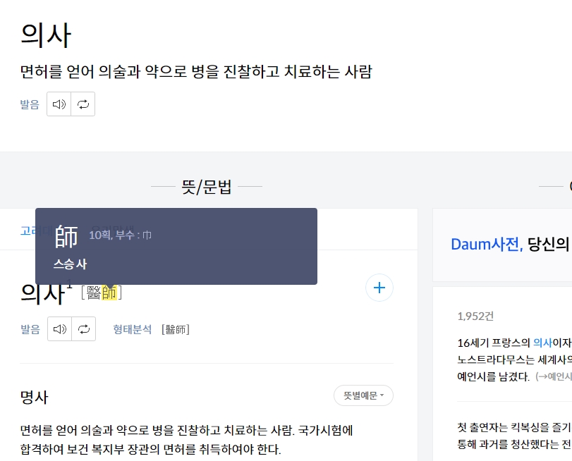 병을 고치는 사람의 의사에 해당하는 한자를 클릭하면, 의 (의원)와 사 (스승)로 구성된 것을 확인할 수 있어요. 이처럼 때때로 예상치 못한 해석이 나타나는 것은 한자의 다층적인 의미와 역사적 배경 때문입니다. 이러한 정보는 한자를 더 깊이 이해하는 데에 도움이 됩니다.