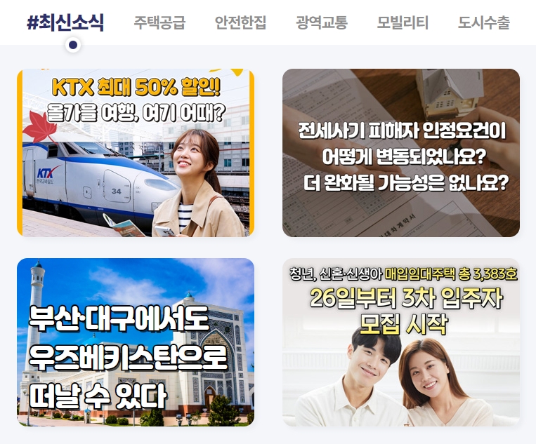 10. 홈페이지를 통해 다양한 최신 정책 소식도 놓치지 않고 확인할 수 있습니다. KTX 할인이 적용된 여행 정보를 비롯해, 전세 사기 피해자 인정 요건의 변화, 청년 신혼부부 매입 임대주택 입주자 모집 정보 등 국민 생활에 유익한 정보들이 눈에 잘 들어오도록 제공되고 있어요.