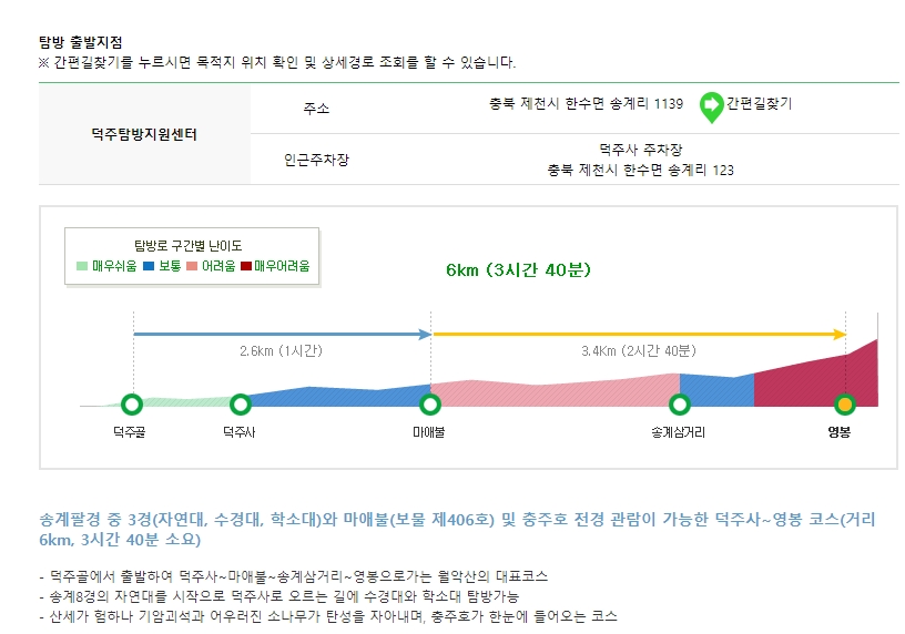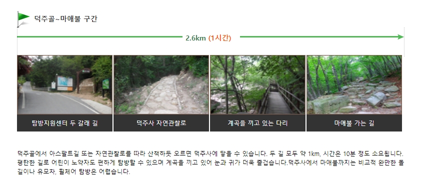 3. 덕주사 코스는 마애불과 충주호를 감상할 수 있는 6km의 길로, 약 3시간 40분이 소요됩니다. 덕주골에서 시작해 마애불까지 이어지는 구간은 평탄하고 경치가 아름다워 많은 이들이 찾습니다.