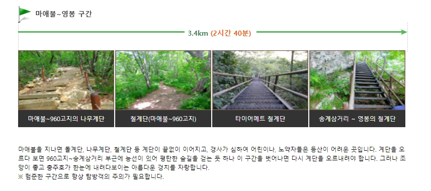 4. 마애불에서 영봉까지 이어지는 3.4km 구간은 돌계단과 철계단을 따라가는 험난한 경로로, 도전적인 등반을 즐기는 사람들에게 적합합니다. 이 구간은 송계삼거리를 거쳐 영봉에 도달하며, 경사가 가파르지만 보람이 큰 코스입니다.