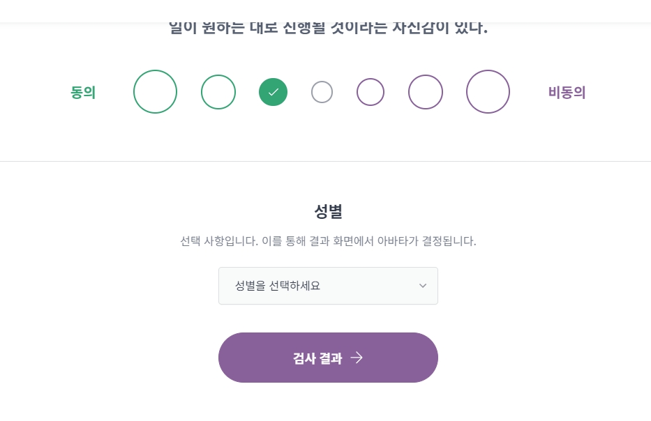 6. 질문을 완료하고 나면 성별을 선택하거나 선택하지 않고 검사 결과를 확인할 수 있습니다. 성별 선택은 검사 결과에 큰 영향을 미치지 않아요.