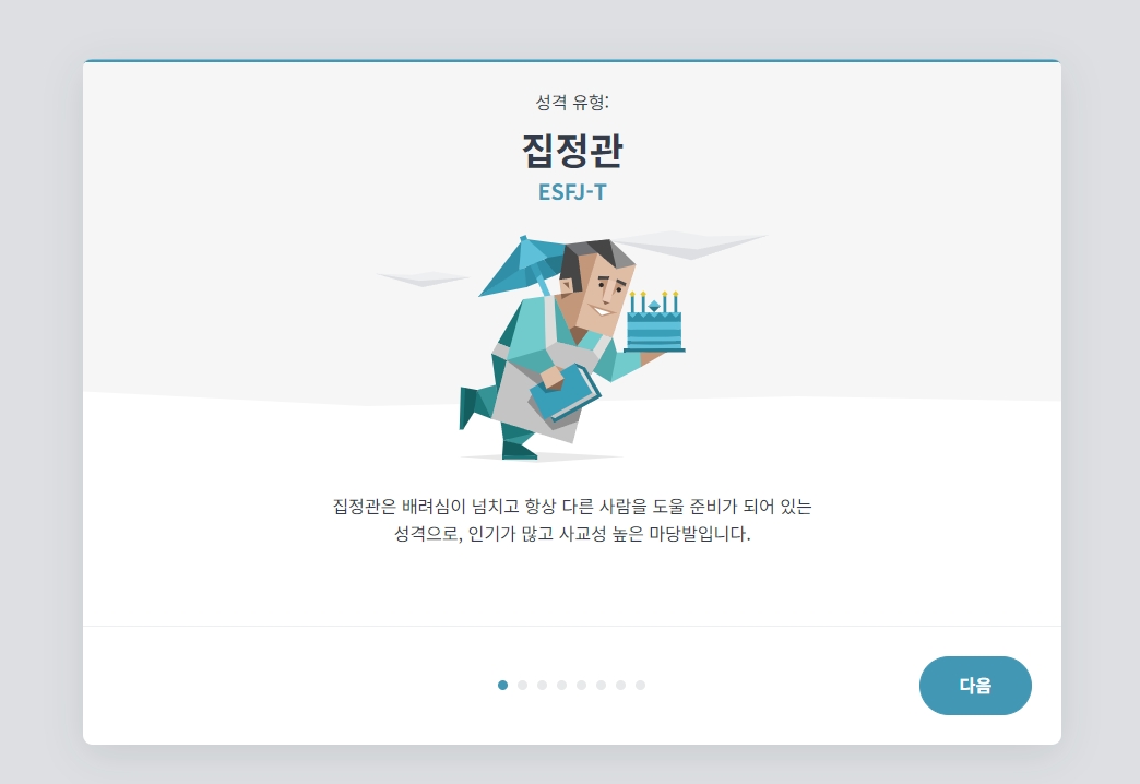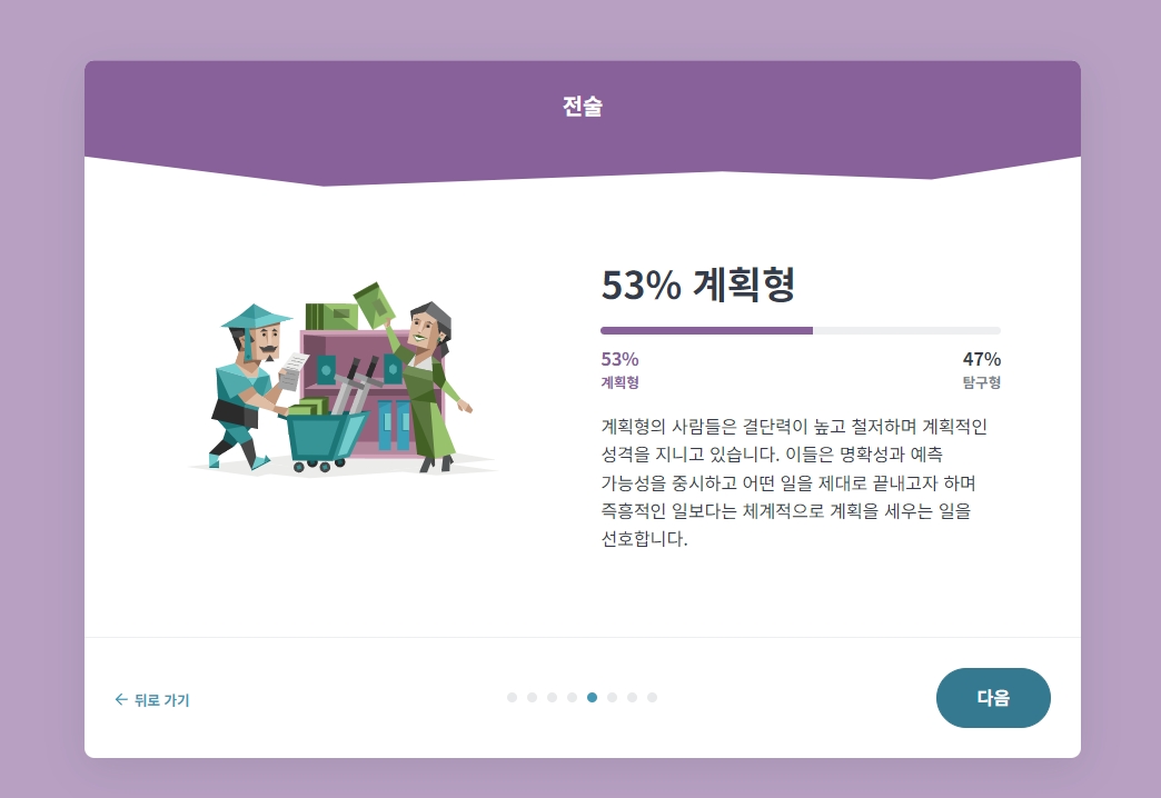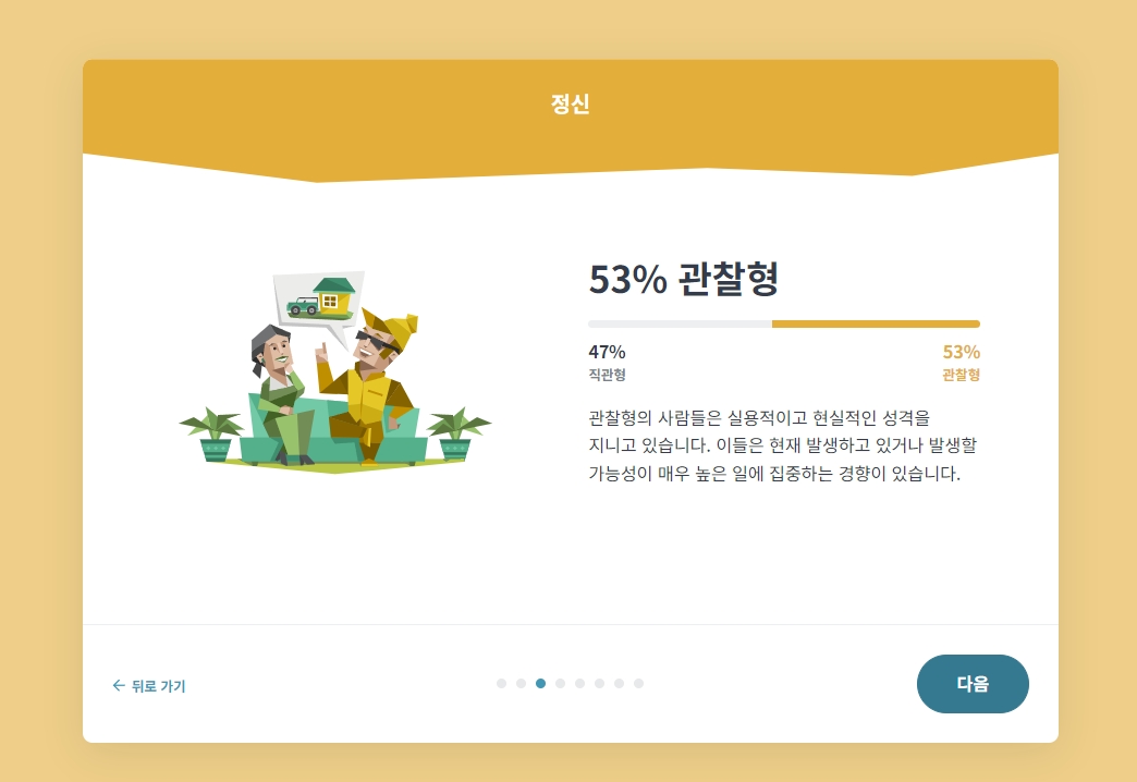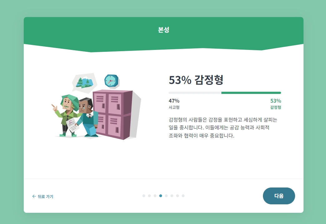 8. 질문을 완료하면, 선택한 성향의 비율이 나타나며 성격 유형 결과를 볼 수 있습니다. 결과는 매우 직관적으로 제공되며, 각 성향의 비율도 함께 보여줍니다.