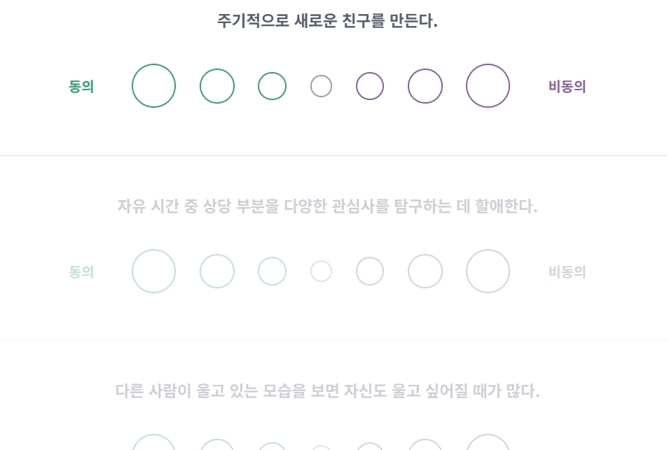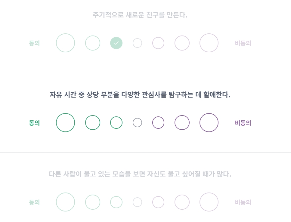 5. 질문들은 직관적이며, 흐릿하게 표시된 질문 외에도 선택할 수 있는 항목들이 있어요. 모든 질문에 답을 하면 다음 단계로 넘어가게 됩니다.