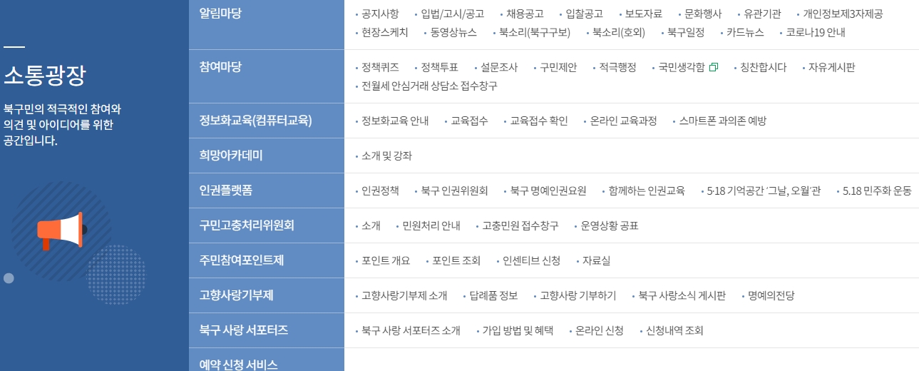 1. 광주 북구청 홈페이지로 들어가면 구정 주요 시책을 비롯하여 전자 민원창구, 다양한 사회복지 정보, 관광 정보와 같은 종합적인 행정 서비스를 제공받을 수 있어요. 위치는 광주광역시 북구 우치로에 자리하고 있으며, 각종 생활 편의 서비스를 편리하게 이용할 수 있답니다.