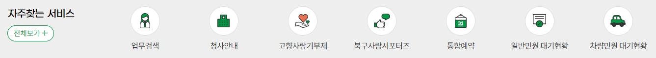 9. 자주 찾는 서비스는 주민들이 자주 이용하는 서비스들을 한눈에 모아 놓은 메뉴예요. 청사 안내나 차량 민원, 통합 예약 등의 정보들을 빠르게 확인할 수 있어서 매우 편리하답니다.