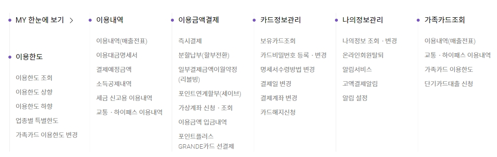 4. 카드정보 관리 섹션에서는 보유하고 있는 카드 조회와 명세서 발급, 결제계좌 변경 등 다양한 카드를 쉽게 관리할 수 있어요. 카드 분실 시 해제 요청도 여기서 바로 처리할 수 있어, 중요한 상황에서도 빠른 대응이 가능합니다.