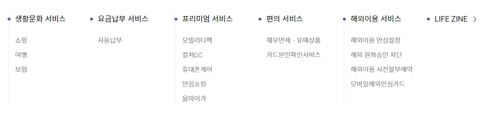 7. 해외 이용 서비스 또한 편리하게 제공돼요. 해외 여행이나 출장 시에 안심 설정, 원화 승인 차단 등의 기능을 활용하여 안전하게 카드 이용을 할 수 있고, 해외 사전 할부 예약 서비스도 제공되니, 여행 중에도 큰 불편 없이 사용할 수 있어요.