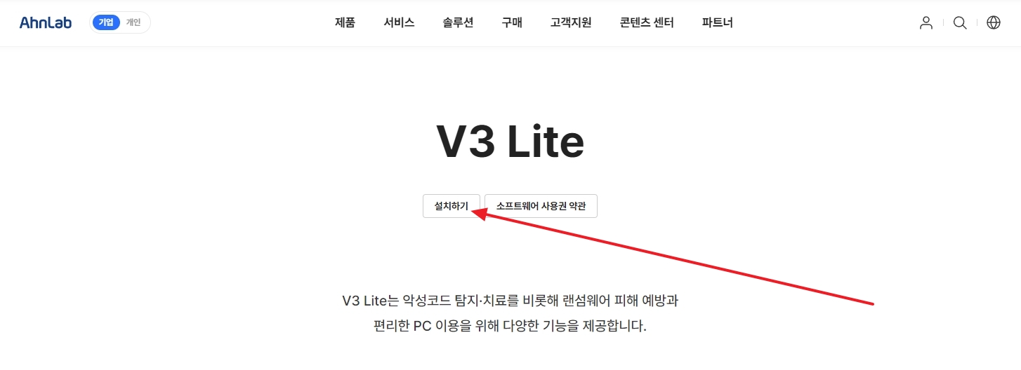 2. 다운로드 페이지에서 설치하기 버튼을 클릭하면 다운로드가 자동으로 시작됩니다. 완료된 파일을 실행하여 V3 Lite를 설치하고 즉시 사용할 수 있습니다.