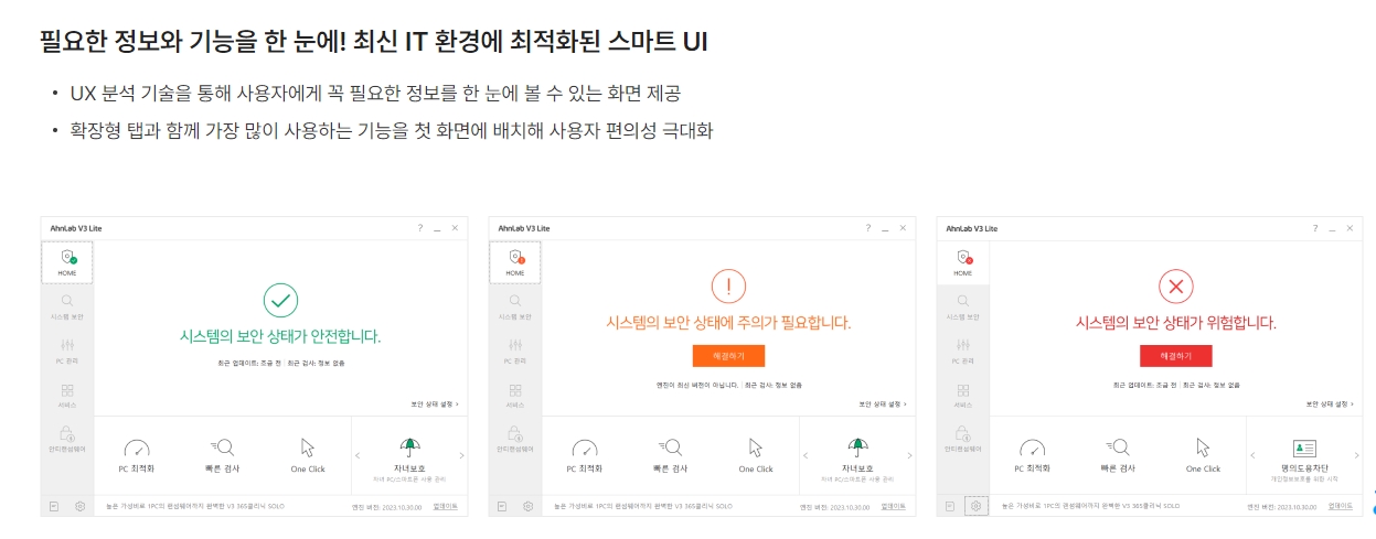 6. V3 Lite는 사용자가 쉽게 사용할 수 있도록 UX를 개선하여, 사용자 친화적인 인터페이스를 제공합니다. 주요 기능을 첫 화면에 배치하고, 직관적인 디자인을 통해 백신 프로그램의 사용성을 극대화했습니다.