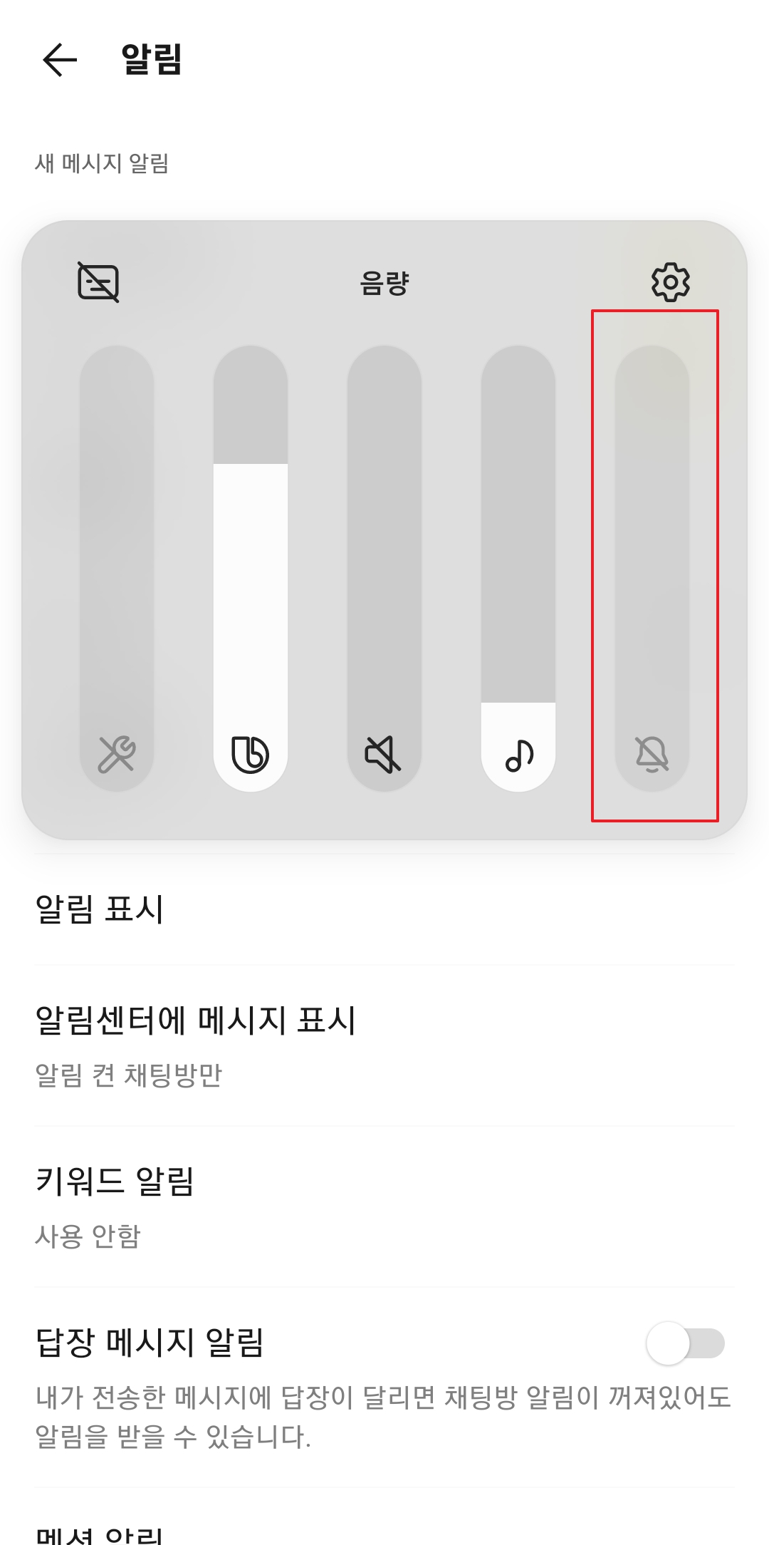 3. 카카오톡 알림음이 들리지 않는다면, 새 메시지 알림 부분을 확인해야 합니다. 메시지 알림이 꺼져 있으면 소리, 진동, 알림창이 모두 뜨지 않아요. 이 경우, 메시지 알림을 켠 후 소리 설정도 함께 켜주세요. 사진처럼 꺼져 있는 상태에서 소리 설정을 활성화하는 것이 중요합니다.