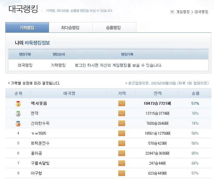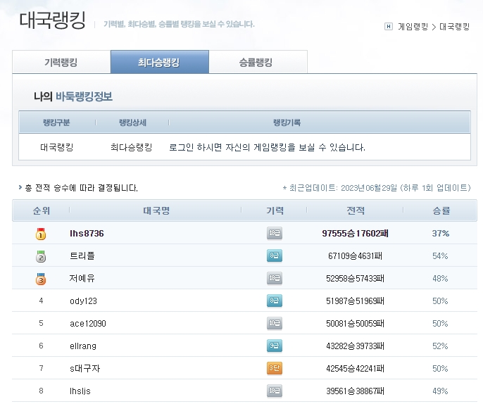 5. 대국 랭킹에서는 최다승 기록을 가진 사람이 압도적인 경기 판수로 상위를 유지하고 있습니다. 2등과 비교해도 경기 판수가 거의 두 배 차이가 날 정도로 활동적인 유저들이 순위에 올라 있습니다. 이처럼 피망 바둑은 꾸준히 활동하는 유저들에게도 좋은 환경을 제공합니다.